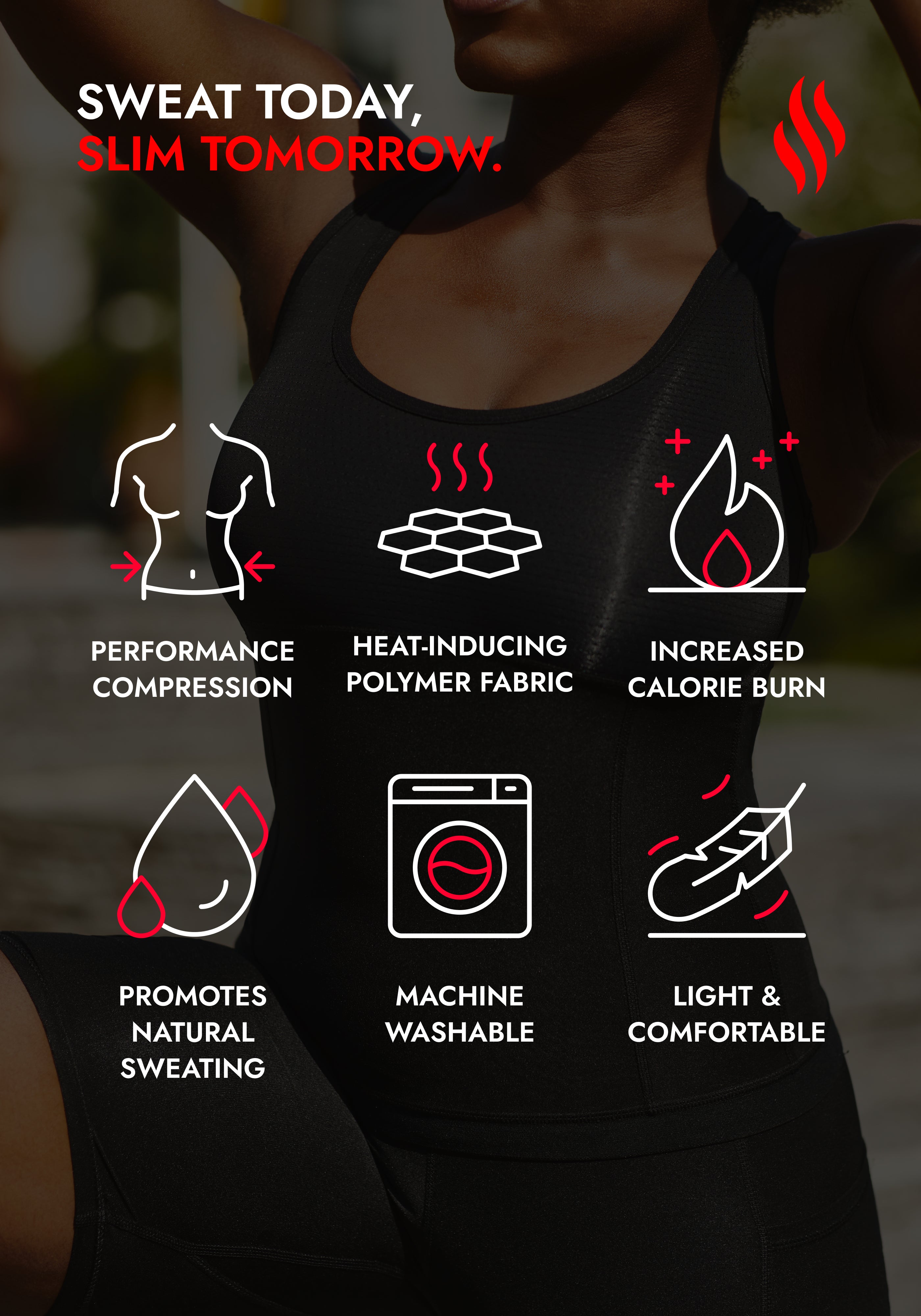 This wardrobe essential racerback tank combines the comfort and ease of a classic racer with Sweat Shaper's powerful compression tech. Our design eliminates love handles and minimizes jiggle, so you can feel confident and comfortable during sweat-soaked workouts. Sweat Shaper combines an exclusive blend of performance compression and polymer fabrics that work together to accelerate your natural body heat and create an intense sauna-like experience. Built to improve recovery and prevent muscle strain, our tank hugs every inch of your torso for 360 degrees of compression, support, and sweat induction so you get the most out of every workout.
